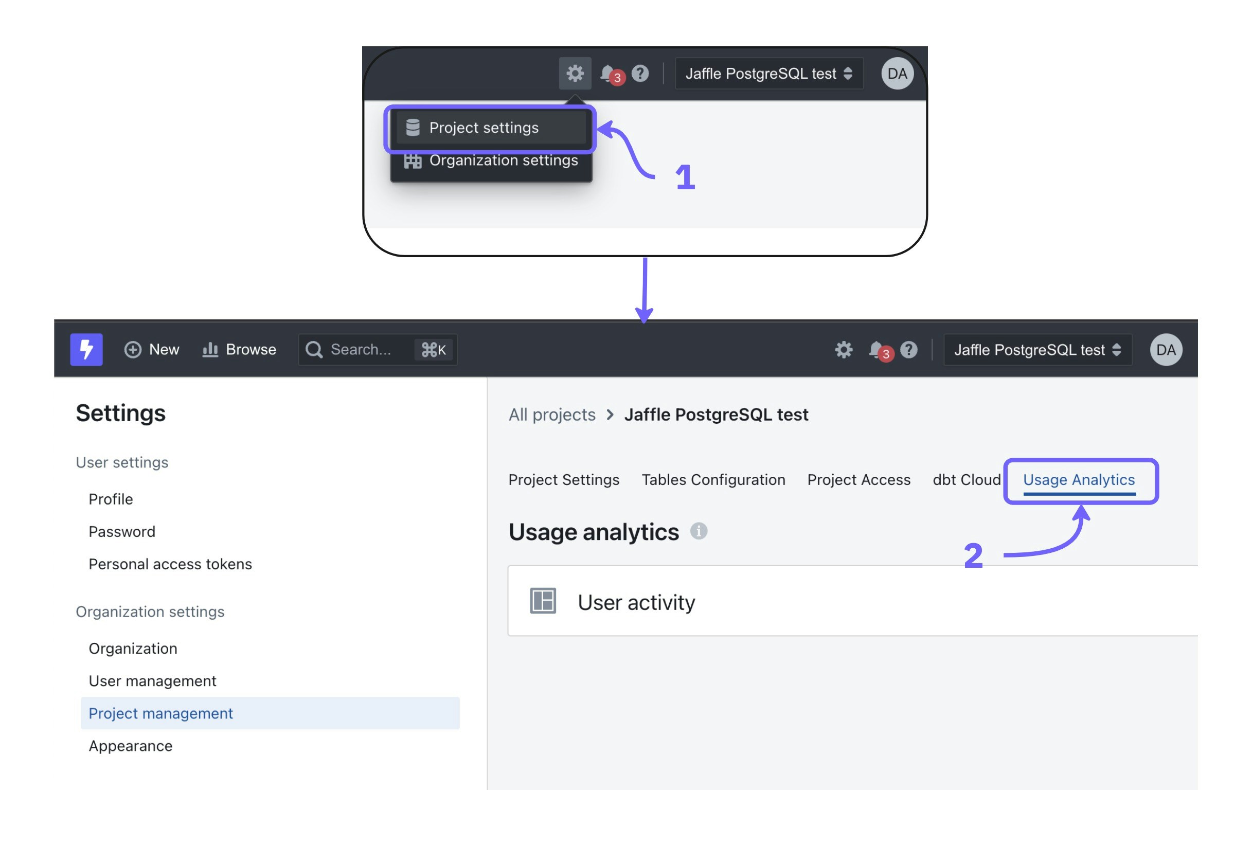 Each project has usage analytics dashboards created by Lightdash giving you an overview of your project’s content and user activity. To see your usage analytics dashboards for a project, just click on thesettings icon, project settings, then usage analytics.