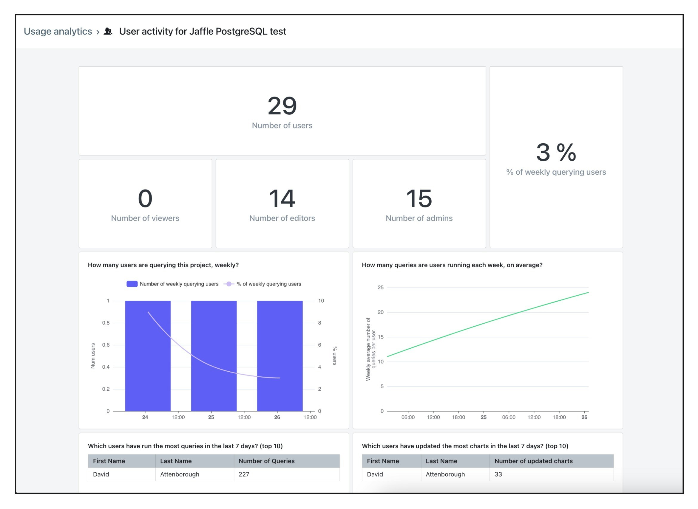 - Users that have updated the most charts in the last 7 days: a list of users that have updated (including created) the most charts in the project in the last 7 days.